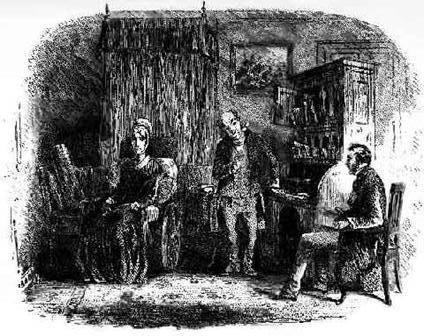 Flora tried in vain to soothe the excellent woman by explaining that they were going home to dinner. Mr F.’s Aunt persisted in replying, ‘Bring him for’ard and I’ll chuck him out o’ winder!’ Having reiterated this demand an immense number of times, with a sustained glare of defiance at Little Dorrit, Mr F.’s Aunt folded her arms, and sat down in the corner of the pie-shop parlour; steadfastly refusing to budge until such time as ‘he’ should have been ‘brought for’ard,’ and the chucking portion of his destiny accomplished.