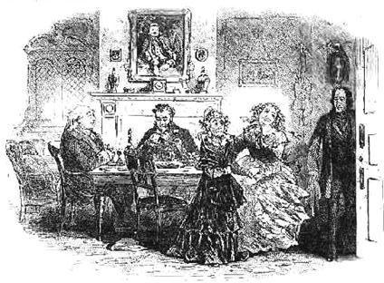 Flora’s eyes were a little red, and she seemed rather out of spirits. Mr F.’s Aunt was so stiffened that she had the appearance of being past bending by any means short of powerful mechanical pressure. Her bonnet was cocked up behind in a terrific manner; and her stony reticule was as rigid as if it had been petrified by the Gorgon’s head, and had got it at that moment inside. With these imposing attributes, Mr F.’s Aunt, publicly seated on the steps of the Marshal’s official residence, had been for the two or three hours in question a great boon to the younger inhabitants of the Borough, whose sallies of humour she had considerably flushed herself by resenting at the point of her umbrella, from time to time.